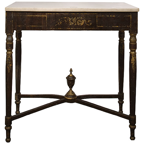 Fancy painted pier table with original marble top, turned legs, arched central stretchers, adorned with urn finial, standing on turned feet. Traces of original rose grainpaint. First Period. Baltimore, MD. Circa 1800.