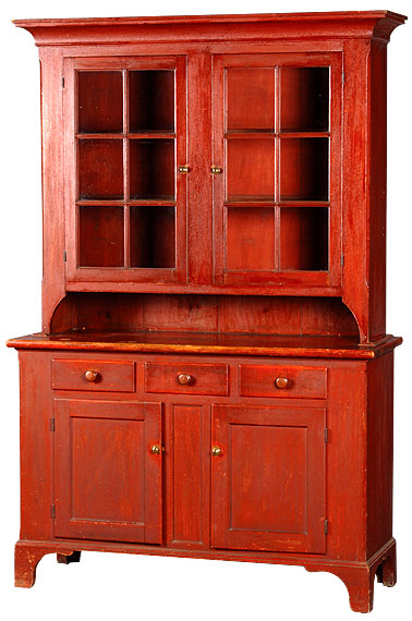 Step-back cupboard with tall bracket feet and three drawers in base. Top consists of two 6-pane doors and large cove molding, polychromed in brilliant red. All original condition. Lehigh County, PA. Circa 1820.