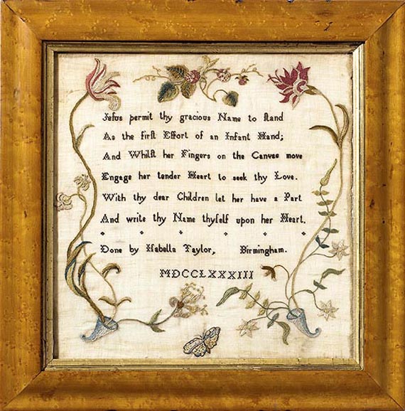 This is a fine sampler made by Isabella Taylor of Birmingham, England who used Roman Numerals to indicate the year the sampler was made, 1783. A naturalistic border of flowering vines emanating from cornucopias, with a strawberry plant above and a butterfly below, surrounds the verse, which is the one found most frequently on both English and American samplers.