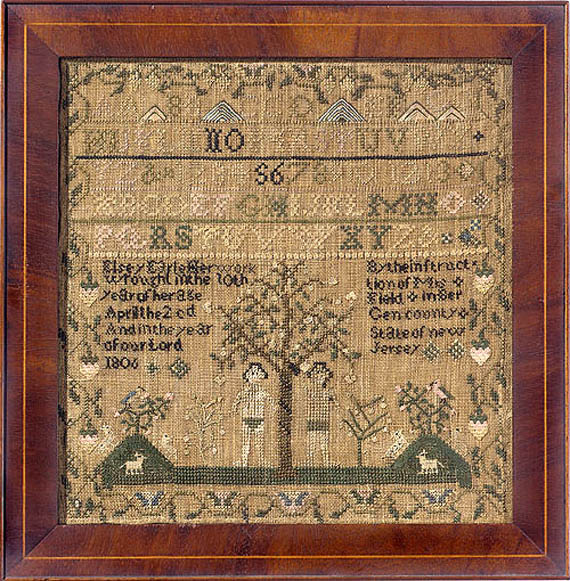 Adam and Eve samplers were rarely made by American schoolgirls and the majority are from New York City and environs. These samplers generally belong to a group made predominantly in the last half of the 18th century in New York and are referred to as the Biblical Samplers as they depict various Biblical scenes including Adam and Eve. Not surprisingly, this influence found its way to Bergen County in northern New Jersey where a previously undocumented instructress, Miss Field, supervised young Elsey Earle as she worked this very appealing and folky rendition of Adam and Eve and the serpent-wrapped apple tree.