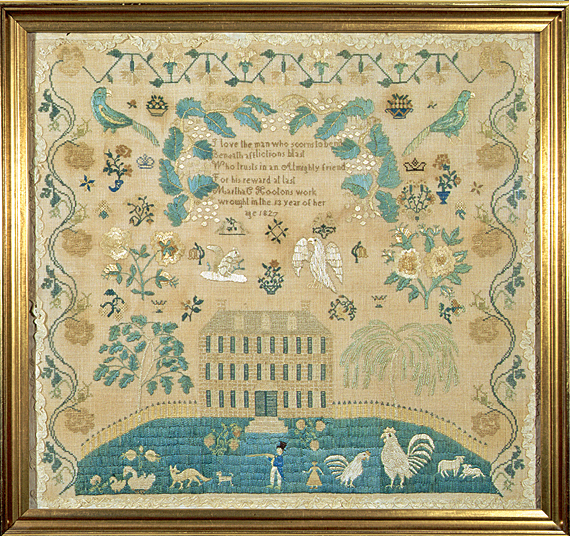 Reads: I love the man who scorns to bend/ Beneath afflictions blast/ Who trust in an Almighty friend/ For his reward at last. Martha C. Hooton's work/ wrought in the 13 year of her/ age 1827.