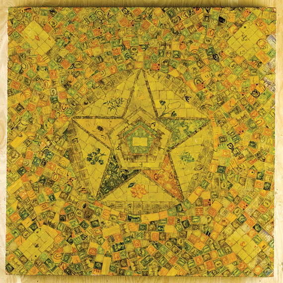 A unique American folk art Card Table with applied U.S. stamps. The complex pattern reminds one of the best “crazy quilts”. Circa 1937. Dimension 30" square.