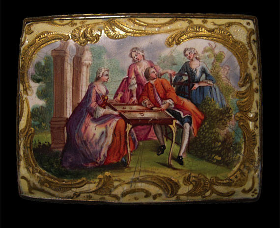 A Rare South Staffordshire Enamel Box, England, circa 1770, Backgammon players in a garden.
