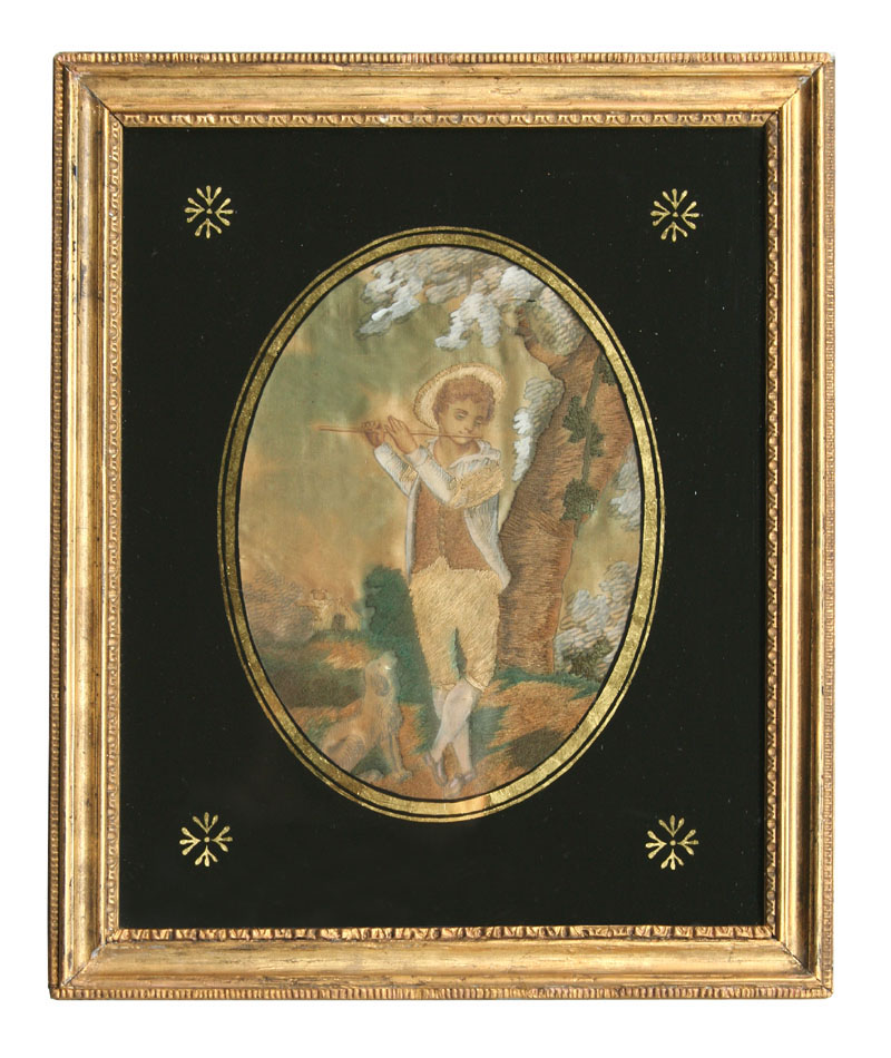 English silk embroidery and watercolor of a young boy playing the flute with a dog in a landscape setting, unrestored with no splits in the silk and minor toning of the fabric, now backed with archival back board, the verre eglomise mat is restored, the apparently original frame has been touched up and shows minor wear, early 19th century, 11-3/4" X 14-1/4" frame size, 6" X 8-1/4" oval sight size.