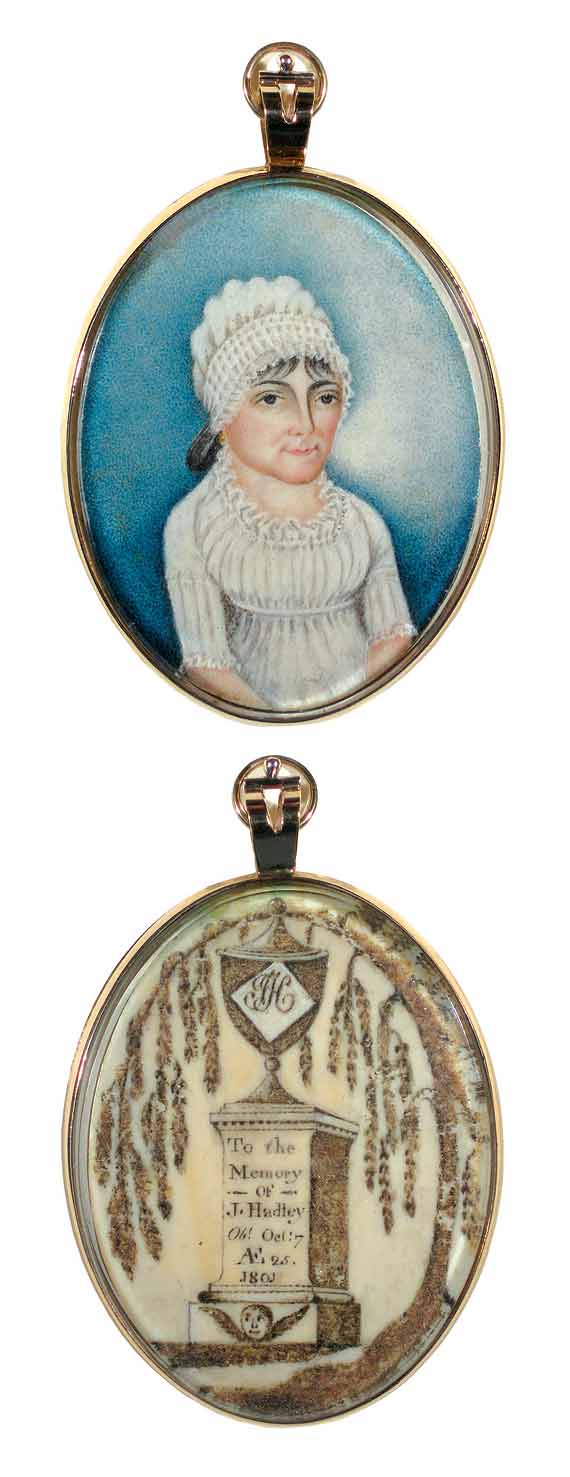 Wonderful folky, double-sided portrait of J Hadley, framed together in a locket case with a cut hair memorial for her showing an urn-topped plinth and willow tree. Dated 1801.