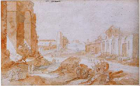 | Pieter Stevens was a painter in Antwerp in 1589 until he was appointed court painter to Emperor Rudolf II in Prague in 1594. He was primarily a landscape painter and draughtsman. After 1600, he composed several moonlight landscapes, working on light effects. As he was in Prague, his landscape designs were reproduced in pietra dura to ornament pieces of furniture made at the court workshop, they were also engraved by Several engravers like Hendrich Hondius (1600, 1601, 1605) and Aegidius Sadeler (1607,1620), who published series of Bohemian forest views. They were executed around Prague, after Stevens and other artists designs and played an important role in the development of 17th century Dutch and Flemish landscape paintings. Stevens is last mentioned in Prague in 1624. This drawing is part of a series of numbered--at least fifty-three--drawn views around Brussels, Rome, Naples and Prague. Twenty-six of them are known, five of which are in the Institut Neerlandais in Paris. This group could have been intended to be engraved, perhaps by Aegidius Sadeler who published a similar series in 1606 after Jan Breughel the elder. The later also happened to be visiting Prague in 1604. He probably influenced Stevens in his drawing technique as he evolved from pen and dark brown or black ink against deep blue washes to soft tones and increased use of the brush. Thus, the present work can be dated shortly after 1604. * * The Grove Dictionary of Art