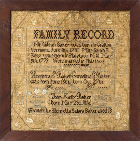 While in Plaistow, Miss Baker worked this lovely family record, which lists the births of her parents, Henrietta and her brothers. Stitched in black silk, the information is bold when paired with the pale blue and ivory thread used in creating borders and motifs. Thin vines encircle the parents' and each individual child's bit of history. Baskets of flowers flank John Kelly Baker's cartouche, and Henrietta stitched her inscription underneath. A fine sawtooth border frames the record, with a grander floral border encompassing that. Large geometric flowers stand on all four sides of the undulating vine, while freeform, folkier sprigs were composed in each corner.