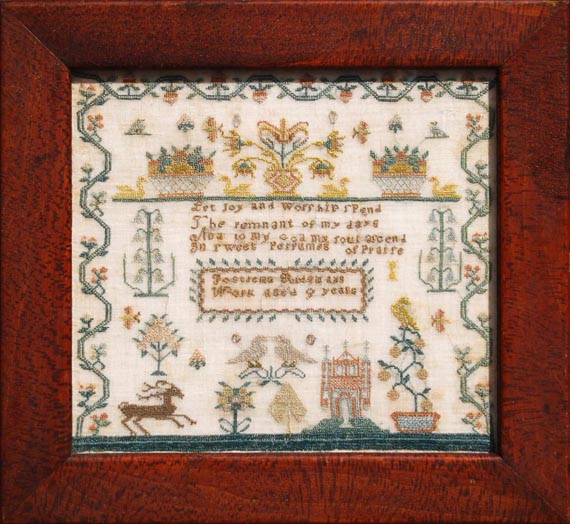 Postrema was clearly working within the 18th century samplermaking traditions of Philadelphia and New Jersey. The motifs that she featured include a leaping stag, castle-like building, paired birds, yellow swans, baskets of fruit, butterflies, stalks of blue bells and a lustrous green lawn and borders formed of double lines with finely worked flowers, buds and berries. A four-line verse reads, "Let joy and Worship spend / The remnants of my days / And to my God my soul ascend / In sweet perfumes of Praise," and the inscription is contained by a leafy cartouche, again a regional characteristic.