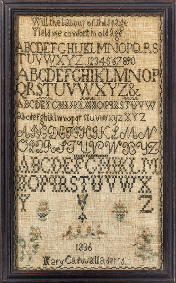 While the specific identity of this samplermaker within the Cadwallader family cannot be discerned, the Quaker affiliation of the maker and her sampler are clear. Mary's flowers, birds and baskets plus two of the alphabets that she included have their origins in classic Quaker sampler design. The two-line rhyming inscription, "Will the labour of this page / Yield me comfort in old age," is one that we have not seen on a sampler previously and one which holds great appeal. It is interesting to note the use of the word "page" to indicate the linen; expresses the thought that samplers were part of a literary tradition. The sampler was worked in silk on linen and is in excellent condition. It has been conservation mounted and is in a black molded and painted frame.