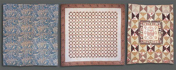LEFT: Fig. 1: Printed wholecloth quilt depicting images from Oliver Goldsmith's poem "The Deserted Village," American, 1815-1825. Cotton. 82-3/4 x 74-1/2 inches. Museum purchase, 1957.125.1.; CENTER: Fig. 2: Pieced quilt with commemorative handkerchief in center, American, 1790-1810. Cotton. 94 x 74 inches. Bequest of Henry Francis du Pont, 1969.566.; RIGHT: Fig. 3: Pieced quilt by Fanny Johnson McPherson, Frederick, Maryland, 1835-1850. Cotton. 117 x 112 inches. Gift of Mrs. John W. Avirett, 1972.57.