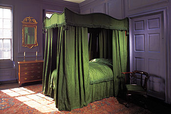 The damask, as stated in the inventory, was green. Apparently the color was a conscious choice based on the social norms of the day, in which crimson was at the top of the color hierarchy and "rooms with green upholstery tended to be more important than those with blue." Since green was associated with "Venus, felicity and pleasure...it was often chosen for best beds."2
