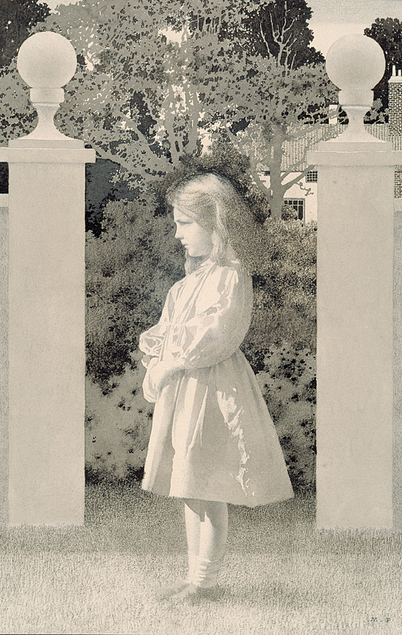 One of thirty-two illustrations drawn by Maxfield Parrish for English writer Kenneth Grahame's The Golden Age, Parrish depicts the experiences of childhood from the perspective of an adult nostalgic for an ideal world that never was. Although the charming young girl, Charlotte, is sad and momentarily isolated, she stands in an idyllic garden, protected by the two sturdy posts that flank her. She seems poised in the portal between childhood and adolescence.