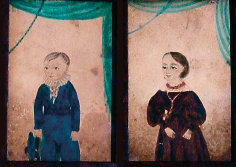 Watercolor folk portraits of Mira and Erwin Williams, at the ages of eleven and five years old, painted in the year 1833. According to the 1930 census, their parents Thomas and Martha, were residents in Chester County, Pennsylvania during this period.