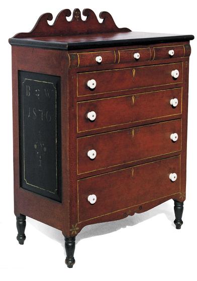Initialed "B.W." and dated '1876,' in brilliant original red, black, and yellow paint. Embellished with gold and silver urn and floral decoration. Retaining its original shellacked surface. This chest is strongly related to other known Conemaugh Township, Pennsylvania examples made for the Wingard Family.