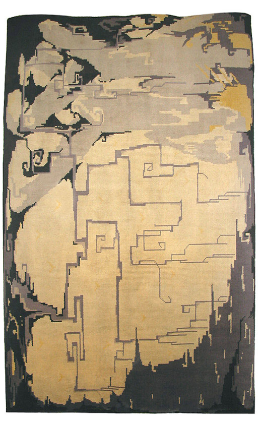 Antique English Art Deco, 1930's. This beautiful study in modernist abstraction may conceal a wealth of traditional oriental secrets. Could it be that there are finely rendered Chinese frets or meanders and curling arabesques sprawling asymmetrically across the surface? Dare we see a large irregular ivory medallion here with corner pieces in the lower area? Is this a stunning modern deconstruction on the ancient vocabulary of rug design, or are we looking at Gorky or Miro translated into decorative floor-covering?