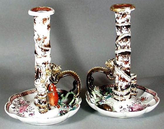 These famille rose candlesticks are exquisitely modeled with a handle of an arched Chinese sepia and gilt dragon climbing the modeled bamboo candle holder. A small, tubular holder designed for spills or tapers, also in the shape of bamboo, branches off from the candle holder. A small ochre tree rat with a detachable head climbs the main branch. Polychrome vines and other small tree rats decorate the lobed octagonal saucer, which is of traditional European form. The saucer is finely painted with pink rose sprigs in the European petit feu palette. One detachable head has been replaced.