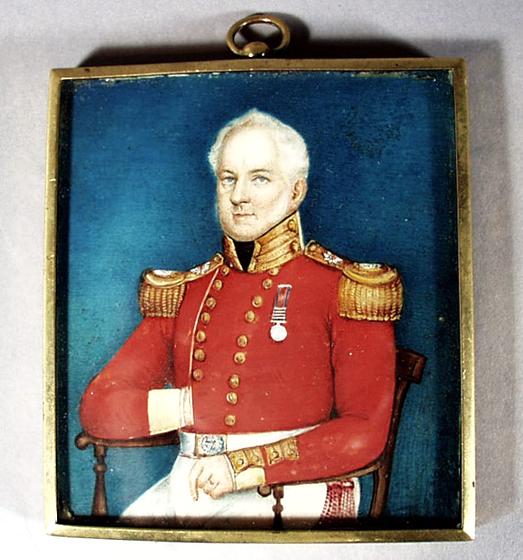 The Major wears the uniform of the 57th (West Middlesex) Regiment of Foot. He wears a Military General Service Medal with four bars. This medal was issued in 1848 for service in the campaigns of 1793-1815. He sits on a chair facing to his right with one arm tucked into his jacket. He wears a scarlet uniform with gold epaulets and buttons. Some flaking to background has been retouched.