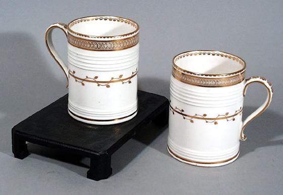 The cylindrical-form mugs have a molded ribbed banding around the foot and below the rim. At the foot is a single gilt band, around the center is a band of gilt vine. Around the rim there is another gilt band of overlapping ovals and dots. Within the inner lip is a further gilt decoration of a wavy line and large dots. The handle is highlighted in gilt on either side and has a decoration of gilt flowers.