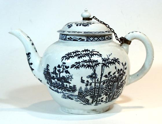 The globular body of the teapot is decorated with a blue transfer Chinoiserie landscape. The neck is adorned with a blue diaper band. A period silver chain connects the handle to the body.