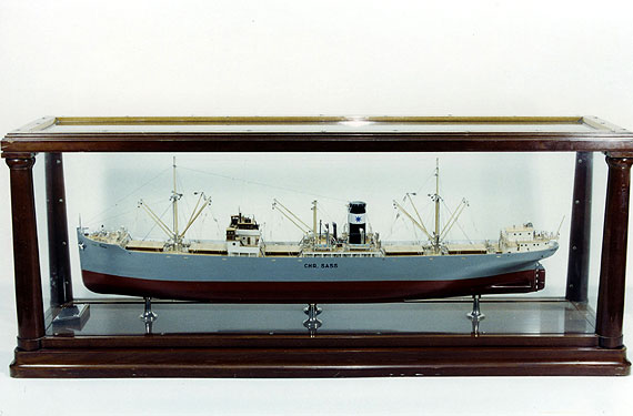 | M/S CHR. SASS This classic builder's model was created contemporaneously with the 7100 ton, twin screw merchant vessel she represented, built at Kobehavn (Copenhagen) in 1930. Configured to the Holm & Wonsild company colors, her length overall was 365', beam 53' and depth 33'. The model and the ship where constructed by the legendary shipyard of Burmeister & Wain, and both constructed to extremely high standards. This type of shelter deck freighter, designed with its five cargo hatches, could carry a multiple of bulk cargo and had world-wide trade capability. The model is constructed in typical fashion of a solid laminated waterline lift hull, authentically painted and detailed per builder's plans. Solid wood superstructure assemblies are well presented and the model includes all rigged cargo cranes and booms. The numerous metal deck fittings are all nickel-silver plated and beautifully machined. The model is mounted in its original glazed case with turned mahogany posts, and silver engraved plaque. Scale: 1/8' = 1', Class: A, Case: 59' L x 23 1/2' H x 16' W
