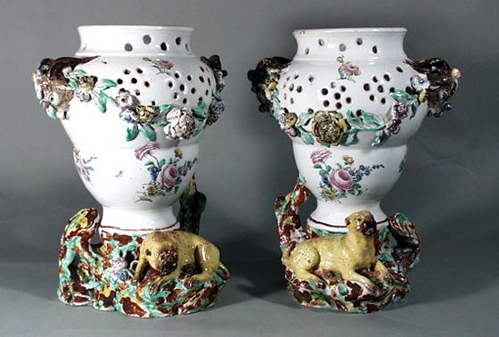 A Pair Of Tournai Faience Potpourri Urns With A Pug Dog.