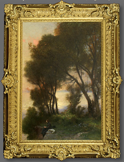 | Leon Jean Bazile Perrault (1832-1908), Solitude. Oil on canvas, 47 x 31-1/2 inches unframed. In original period 19th century French frame. Signed lower right, This magnificent painting was commissioned for a Villa in Poitiers, France. The painting will be included in the forth coming catalogue raisonne. Catalogue raisonne: The raisonne for the Complete works of Leon Bazile Perrault is currently being prepared by Brian D. Roughton, Dallas, Texas and Mr. Patrick Charriaut, Bordeaux, France with the assistance of the Musee de Bordeaux. To learn more about the life and paintings of Leon Jean Bazile Perrault and Ernest Parton as well as nearly six hundred other artists and to see their work, visit our Web site: www.RoughtonGalleries.com. Subscribe to "Art Alert" for Brian's insightful comments on the artwork and to learn the values of the paintings. Request a copy of our winter 2006 catalog.