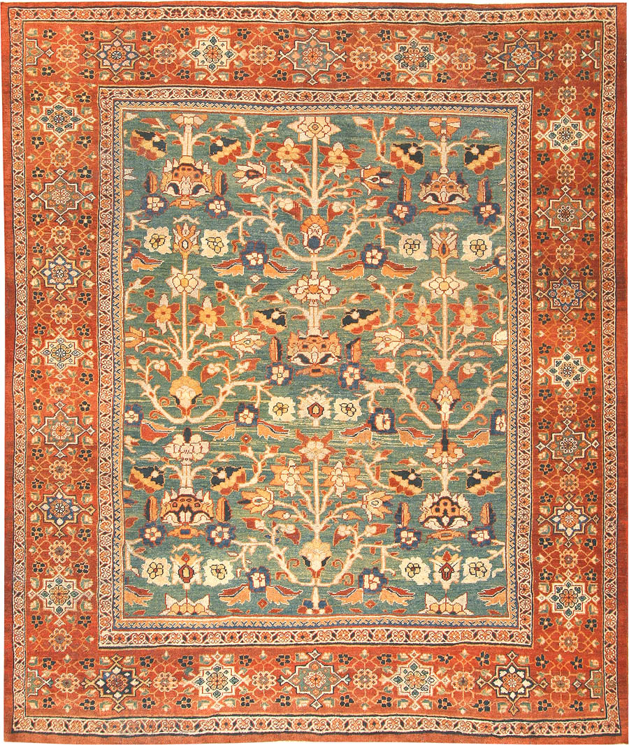 Vertical columns of viney, tree-like shrubs spread in staggered array across the soft green field of this boldly elegant antique Sultanabad. The coloration of these forms - using a domnant ivory for the vines and terracotta, apricot,saffron and blue for the flowers - appears especially lovely against the variegated shades of green. The border of star cartouches and tiny vines on a terracotta ground provides a framing contrast in scale with the monumental design of the field, although using the same range of colors to achieve a larger harmony.