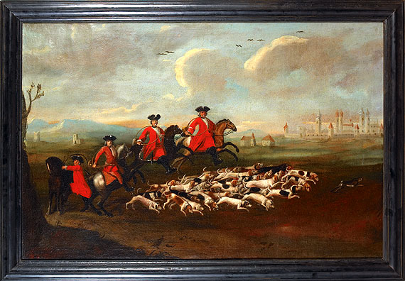 Fine Georgian hunt picture, oil on canvas, circa 1760, showing 4 huntsmen holding hunting horns with their dogs chasing a hare. This type of painting was the inspiration for American overmantle hunt pictures. 38 1/2' x 55' including frame.