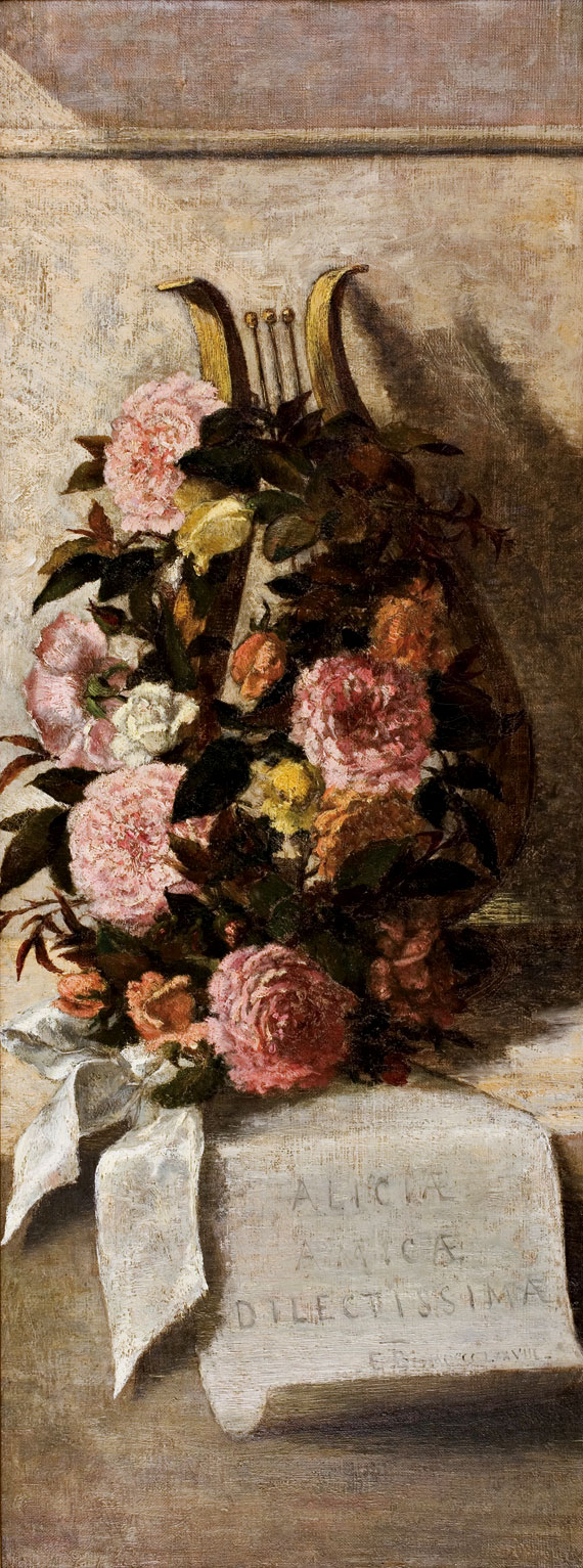 Elizabeth Boott (Duveneck) (1846-1888), Floral Still Life with Roses and Lyre, 1878, oil on canvas, 36 x 14 inches, initialed E.B. and dated in Roman numerals at bottom of scroll. Dedicated to the artist's friend Alice Bartlett with the inscription Aliciae Amicae Dilectissimae on the scroll.