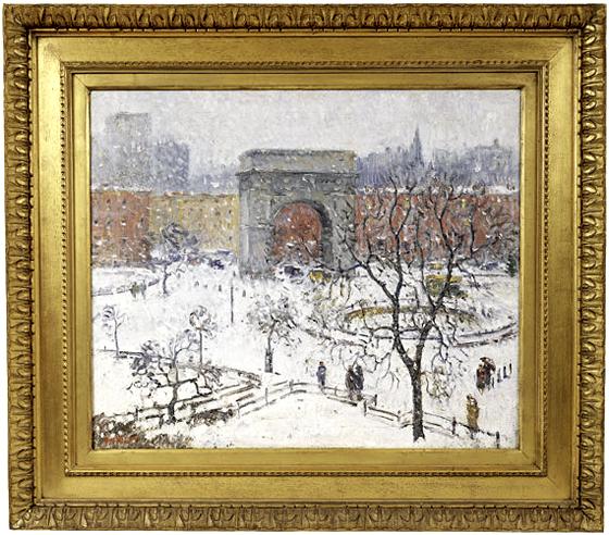 Guy Wiggins (1883-1962), Washington Square, Winter 1927. Oil on canvas. Signed lower left. Dated on the reverse.