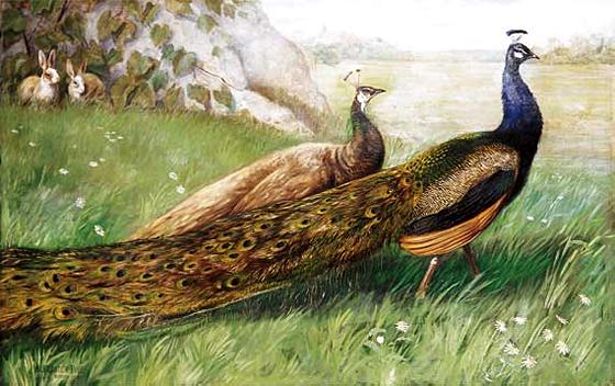 | Alexander Pope, American (1849-1924); Just From Town, 1889; Oil on canvas, 42 x 66 inches; Signed and dated lower left, "Alexander Pope-/Boston- 1889". [Alexander Pope]...depicts simply two peacocks with their gorgeous plumage showing brilliantly against a daisy-dashed meadow. The birds of fine feathers are supposed, by courtesy of imagination, to typify city folk who sometimes visit their country cousins and assume airs of superiority. In this case the only visible country cousins are a couple of rabbits,...which seem surprised and somewhat abashed at the brilliant dress of the visitors in comparison with their own tawny skins. As published in: Brush and Pencil, Vol. VIII (1901)