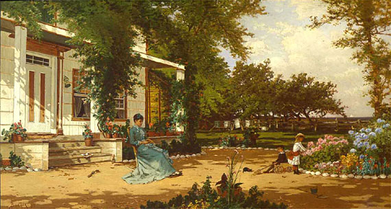 Alfred Thompson Bricher (1837-1908). In My Neighbor's Garden. Oil on canvas, 24-1/8 x 44-1/4 in. Signed, dated, and inscribed (at lower left): ATBricher 83 [initials conjoined]; (on the back of canvas): "In My Neighbors Garden" / a.t. bricher.ana / 1883