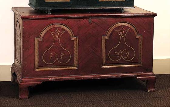 A Pennsylvania poplar dower chest having the rare or unique characteristic of tombstone shaped paneling on the front and sides, initialed R.E. and dated 1782, retaining original painted decoration, feet, and wrought iron strap hinges, 28-3/4 x 48-3/4 x 23 inches.