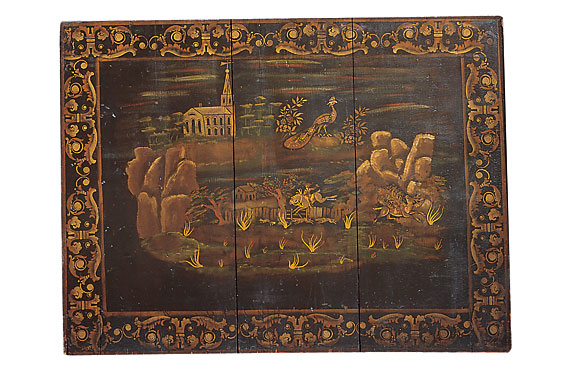 Made for the Gabriel Houston House in Sussex County, New Jersey. The black ground depicts scenes of a fox hunt, church, and various animals. Circa 1831, Dimensions: 48"W x 36-1/2"H