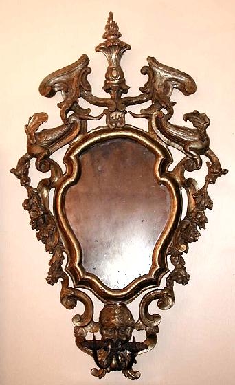 Gilded fir wood (cirmolo), mirror glass and wrought iron