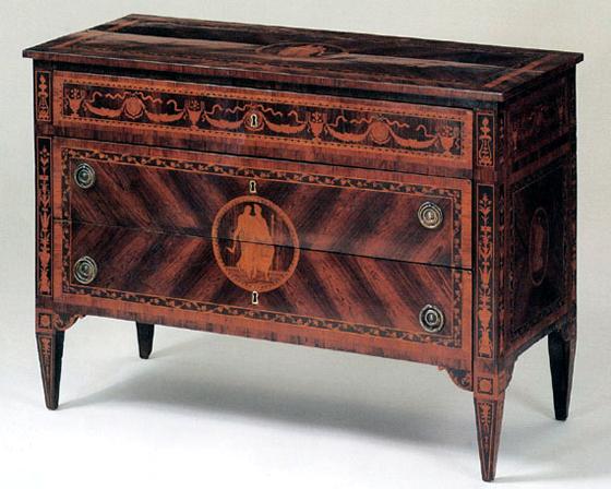 | Giovanni Battista Masfezzoni. Milan, circa 1785-1795.Walnut, fruitwood, kingwood, pine and bronze This finely executed neoclassical commode with 3 drawers, has a rectangular overhanging top, centrally inlaid with a mythological couple in costume, all within quarter veneered panels of kingwood within a trailing vine border. The frieze drawer is inlaid with portrait medallions, flower filled urns and garland swags, above two drawers sensa traversa centered with the reverse figural medallion within a trailing vine border. Each of the lower two drawers is fitted with round bronze handles. The sides of the commode are similarly inlaid with figural medallions, while the corner stiles are inlaid with neoclassical vase motifs, which continue on the tapering square legs. Size: 34 3/4 inches in heigth, 49 inches in width, 22 1/4 inches in depth) (88 x 142 x 56 cm)