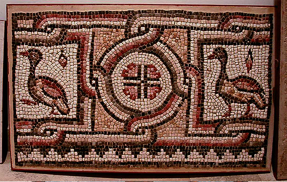 Section depicting flower flanked by geese contained within decorative Roman geometric designs. Antioch, Eastern Roman Empire Fourth Century AD Marble set into cement Size: 23 1/2 inches in height, 37 1/8 inches in width (60 x 94 cm).