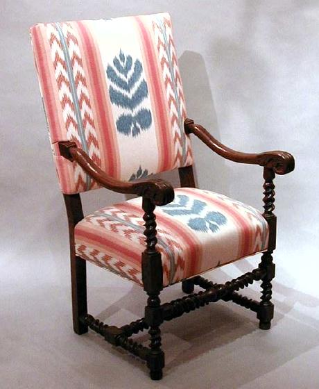 This Louis XIII period armchair has foliate carved arms, turned stretchers, and turned legs.