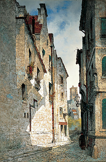 | Edwin Deakin (1838-1923), Rue des Chantres, Paris. Oil on canvas, 30 x 20 inches. An aristocrat from Sheffield, England, Edwin Deakin came to America in 1856, living first in Chicago. In 1870, he moved to San Francisco, established a studio and soon was very much a part of the local art scene. Deakin painted landscapes of ruins and historic architecture. From 1887 to 1890, Deakin was in Europe where he painted scenes from times in the past such as historical streets in Paris like the Rue des Chantres, the oldest and smallest street in Paris on the Ile de la Cite.