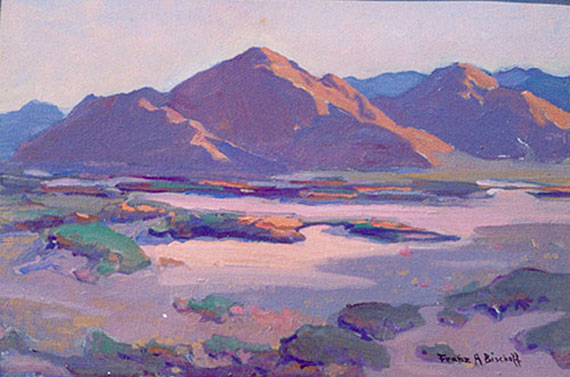 FRANZ BISCHOFF, Imperial Valley. Oil on Board, 13x19 inches. Franz A. Bischoff was born in Bowmen, Austria on January 14, 1864. He received his first art training in the local art school. His artistic aptitude was great and in 1882, decided to continue his studies in Vienna where he studied applied design, watercolor painting and porcelain decoration. Bischoff moved to New York City in 1885 where he worked as a decorator in a china factory. He became one of the most famous porcelain artists of his time specializing in flowers most of which he grew in his own garden. He was best known for his paintings of roses which earned him the name "King of the Roses". In 1906 Bischoff and his family moved to San Francisco, California and began his career as a landscape painter. Soon there after they moved to Pasadena where he opened a studio. Bischoff's paintings were well received by the public and critics alike. In addition to the local landscapes, he painted up the coast in Monterey, and Carmel, in the Sierras, the deserts of Palm Springs and late in his life in Zion National Park in Utah. Bischoff began as a flower painter and evolved into one of America's premier artists. Bischoff died of heart failure in his Arroyo Seco home on February 5, 1929