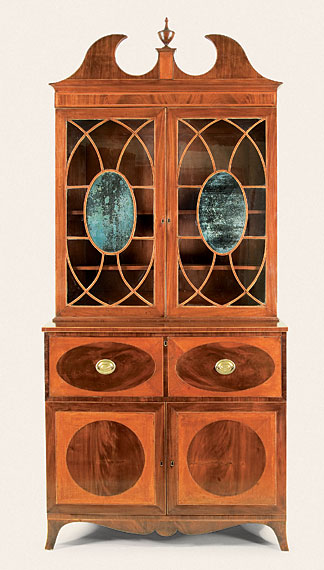 A fine example having a removable broken arch top above an upper case with two lattice glazed doors with oval mirror panels, resting on a base with an upper drawer with oval inlays on a satinwood reserve opening to a fitted interior of small drawers, pigeon holes and a central prospect door, above two doors with round inlays on similar reserve, all resting on French feet.