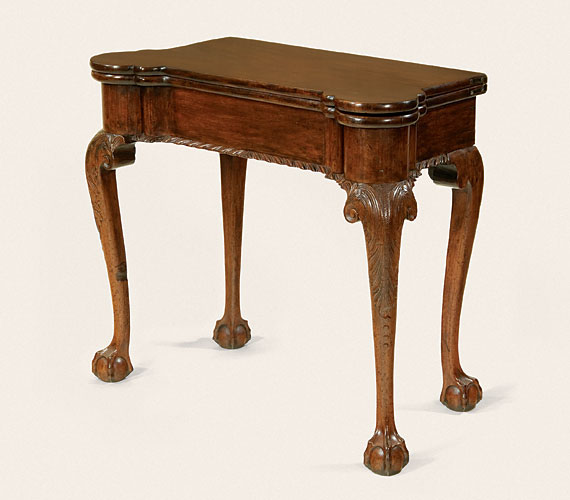 Rare and Outstanding Chippendale Carved and Figured Mahogany Games Table Having a hinged top with turreted corners opening in a baize-lined playing surface with candle pockets, gadrooned apron continuing to acanthus carved cabriole legs with C-scrolled front knee returns and ball and claw feet.