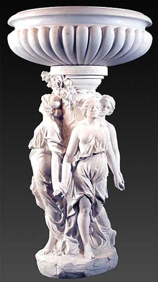 A stunning, monumental marble fountain by eminent 19th-century French sculptor A. Carrier-Belleuse. The large, scalloped bowl of the fountain is supported by the Three Graces, personifications of grace and beauty who attended to several of the Greek goddesses. Carrier-Belleuse, highly regarded by Napoleon III, was acclaimed for his sumptuous and seductive sculpture, which he produced in bronze, terra-cotta, marble and even porcelain. He served as the Director of the Works of Art at the renowned Sevres factory, where his assistants Rodin and Moreau would themselves go on to become noted sculptors. Carrier-Belleuse received a number of prestigious awards throughout his lifetime and is regarded among the greatest artists of the 19th century. This fountain, of such grand proportion, is a rare work by this extraordinary artisan.