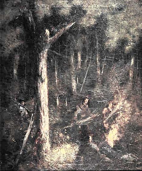 J. Alden Weir (1852-1919); Hunting the Raccoon -- Night Scene, 1905; Signed upper left; Inscribed upper left: to my friend Tarbell; Oil on canvas, 25 x 20 inches