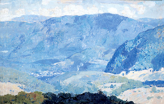 View of the Mountains and Valley. by Daniel Garber (1880-1958). Oil on masonite, 18 x 24 inches. Signed lower right. In a Stanford White frame.