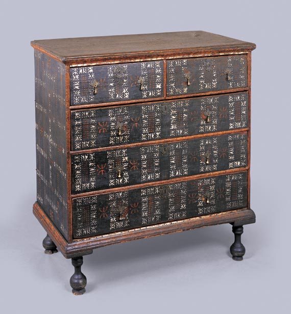 pilgrim century new england paint decorated five drawer chest In a remarkable state of preservation retaining its original bottle-turned ball feet.