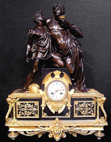 A French patinated bronze, ormolu and black marble gothic revival clock of two bacchanalian male lovers. The outstanding bronzes are from the famous workshop of Charpentier. Clocks with an openly homosexual theme are extremely rare. 8-day bell strike with a silk suspension pendulum. Backplate of the Pons movement signed CJ 904, and Charpentier & Jouay and fils. 24-1/2 x 17-1/2 inches. Circa 1840.