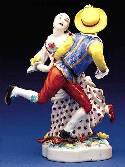 This model was first made by Johann Friedrich Eberlein in 1735 for Meissen and was reworked by Johann Joachim Kandler and listed in his Taxa of 1743 as "Harlequin and a maiden doing a Polish dance, possibly the Mazurka." It was a very popular group and was copied by Bow, Chelsea, and Derby. This is the finest of export figures modeled after European groups and very few examples are known, each having slightly different decoration to the clothing of the figures. When the wreck of the VOC ship Geldermalsen was salvaged in 1985, five damaged examples were recovered though they were white, having lost their enamels due to the corrosion of the seawater. The ship sank in 1752 so a date for these pieces can be proposed with reasonable accuracy.