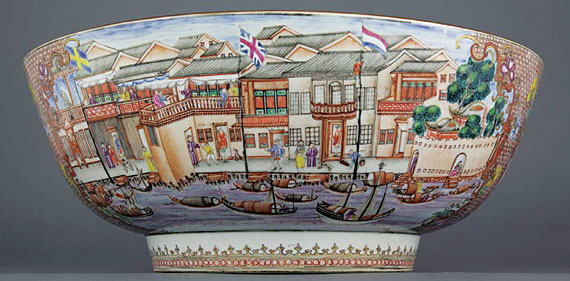 The Hongs on the waterfront at Canton were the enclosed factories and shop fronts where the European traders were permitted by the Chinese authorities to do business. By this date much of the overglaze decoration was being done in workshops behind the shops and their kilns frequently set fire to this part of Canton. Thus these bowls provide a useful record of the changing architecture of the waterfront: this scene is taken from a painting of about 1760. The flags depicted here are Danish, French, Swedish, British and Dutch.