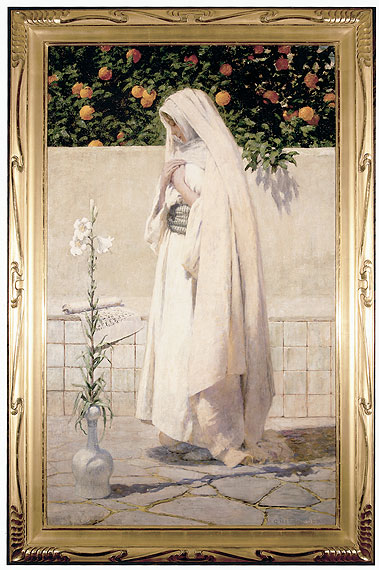 Annunciation. By George Hitchcock (1850-1913). Oil on canvas. SLR; exhibition label verso 65" x 39 1/2"; framed: 74"x49".